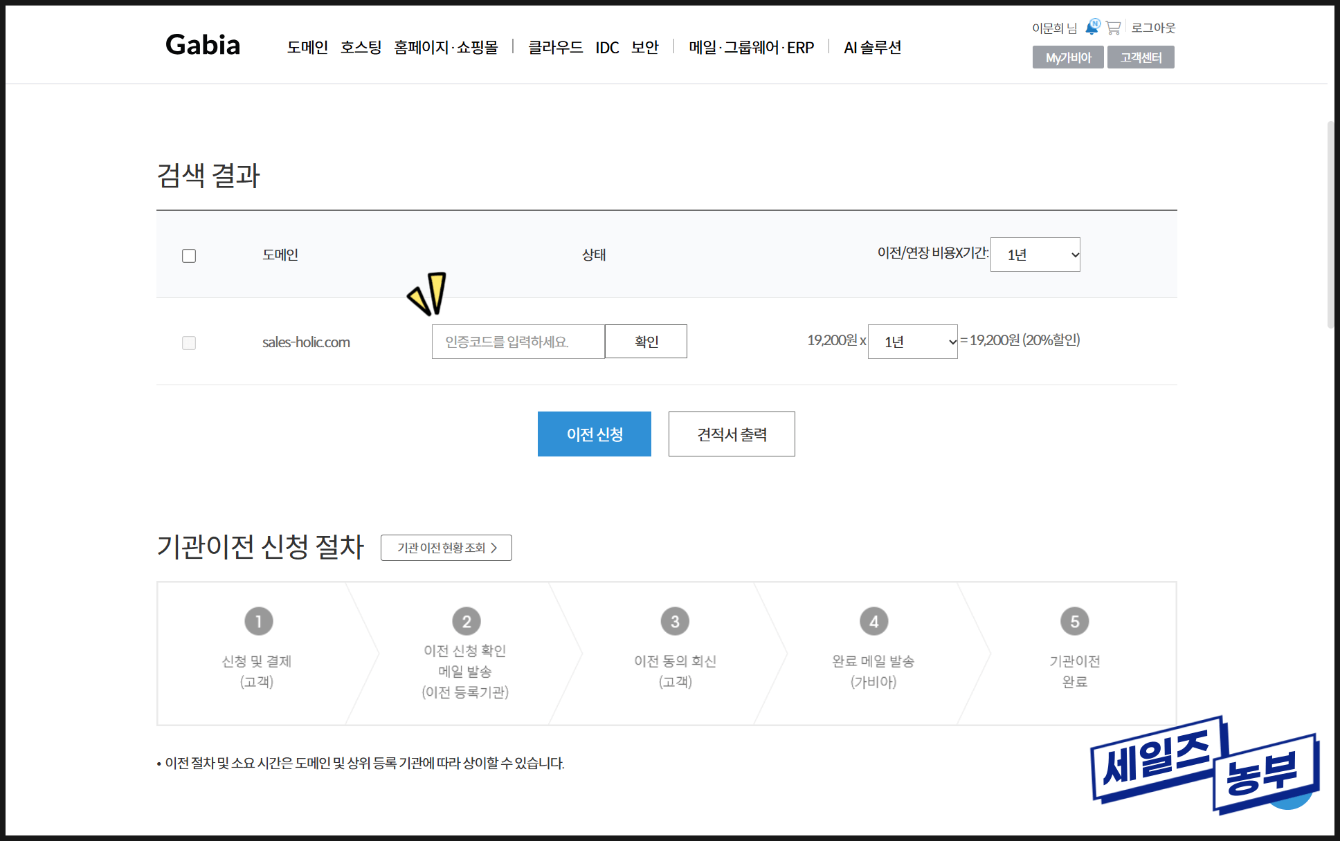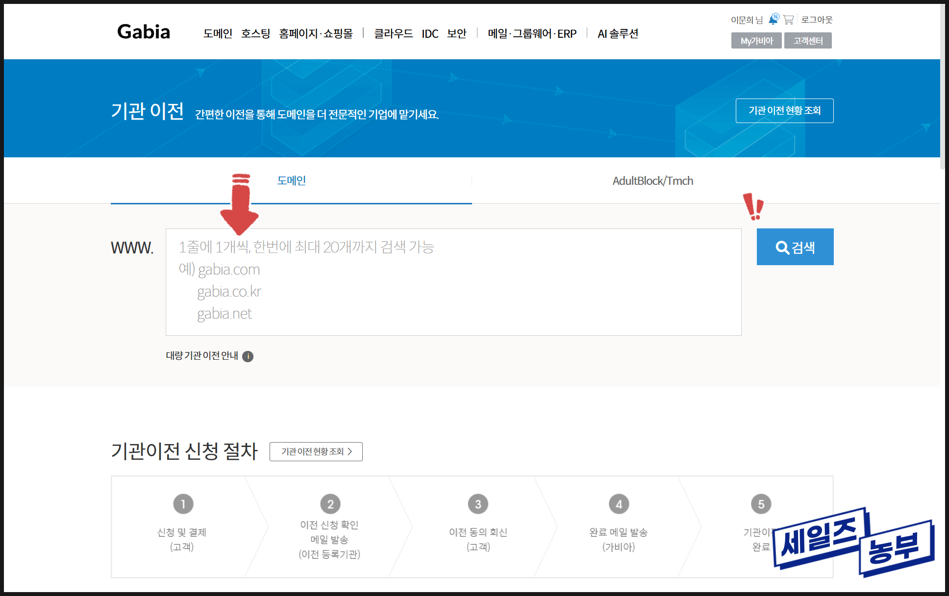 그동안 도메인 등록비용이 저렴하다는 이유로 이곳저곳에 도메인을 등록하고, 제대로 관리하지 못했습니다. 그래서 이번 기회에 ‘기관이전’이란 서비스를 통해 도메인을 모두 가비아로 가져오려고요.