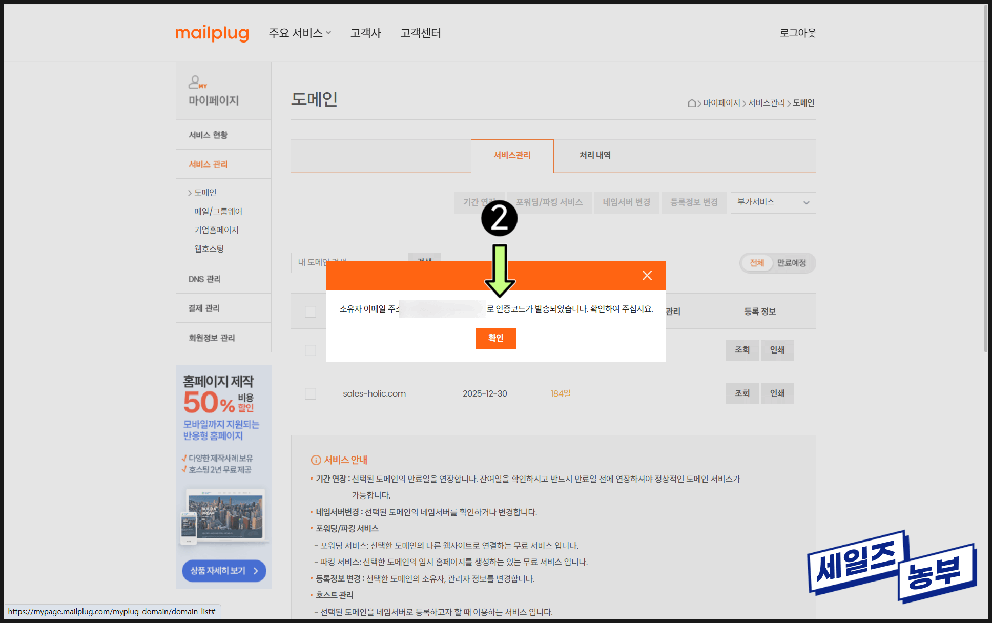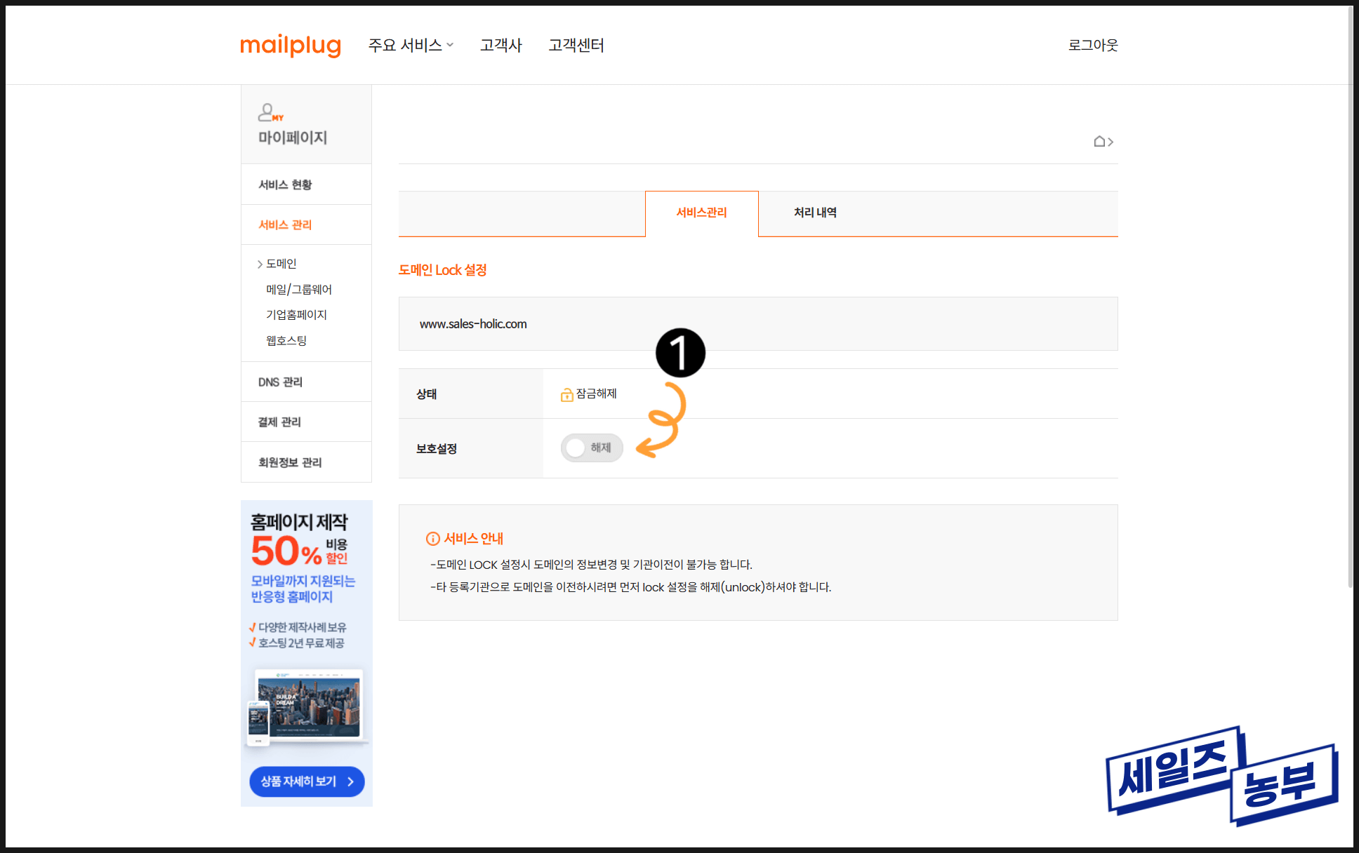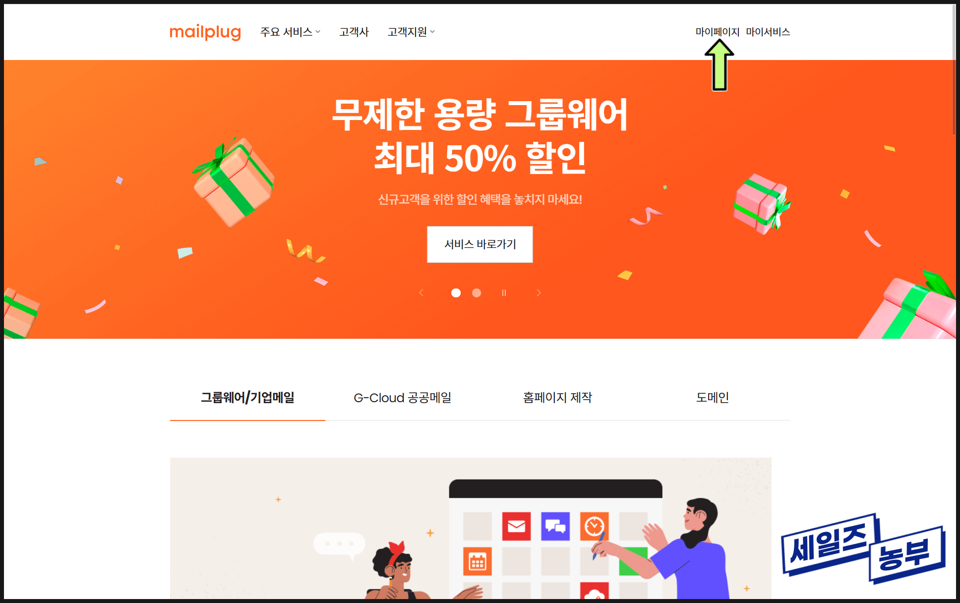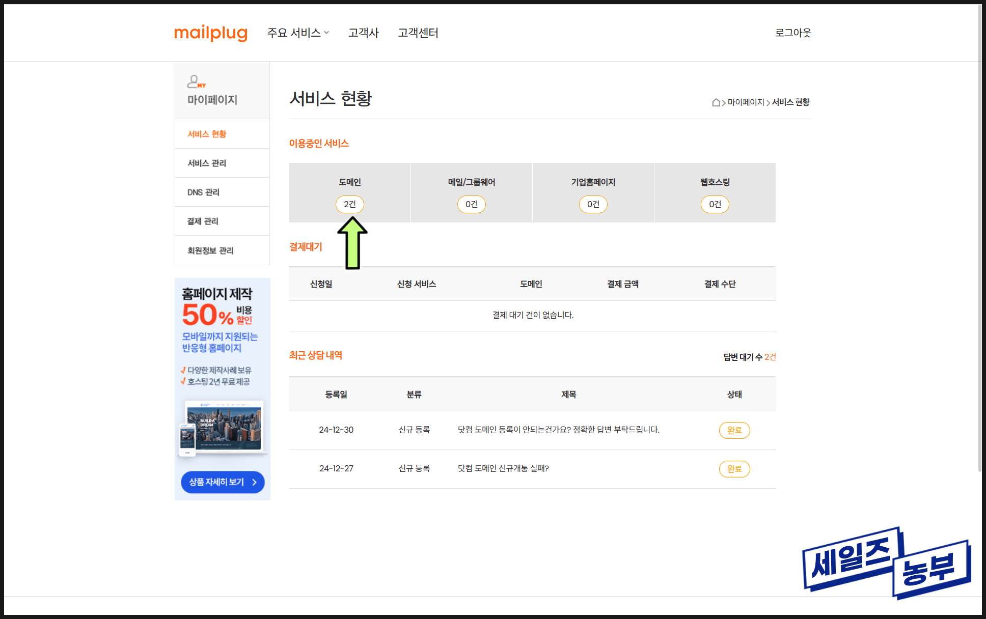 메일플러그라는 그룹 웨어 서비스 사이트인데 도메인 등록 비용이 저렴합니다. 로그인 한 후 '마이페이지'로 들어가 주세요. 그럼 서비스 현황이 보일텐데 여기서 등록해 사용중인 도메인을 눌러줍니다.