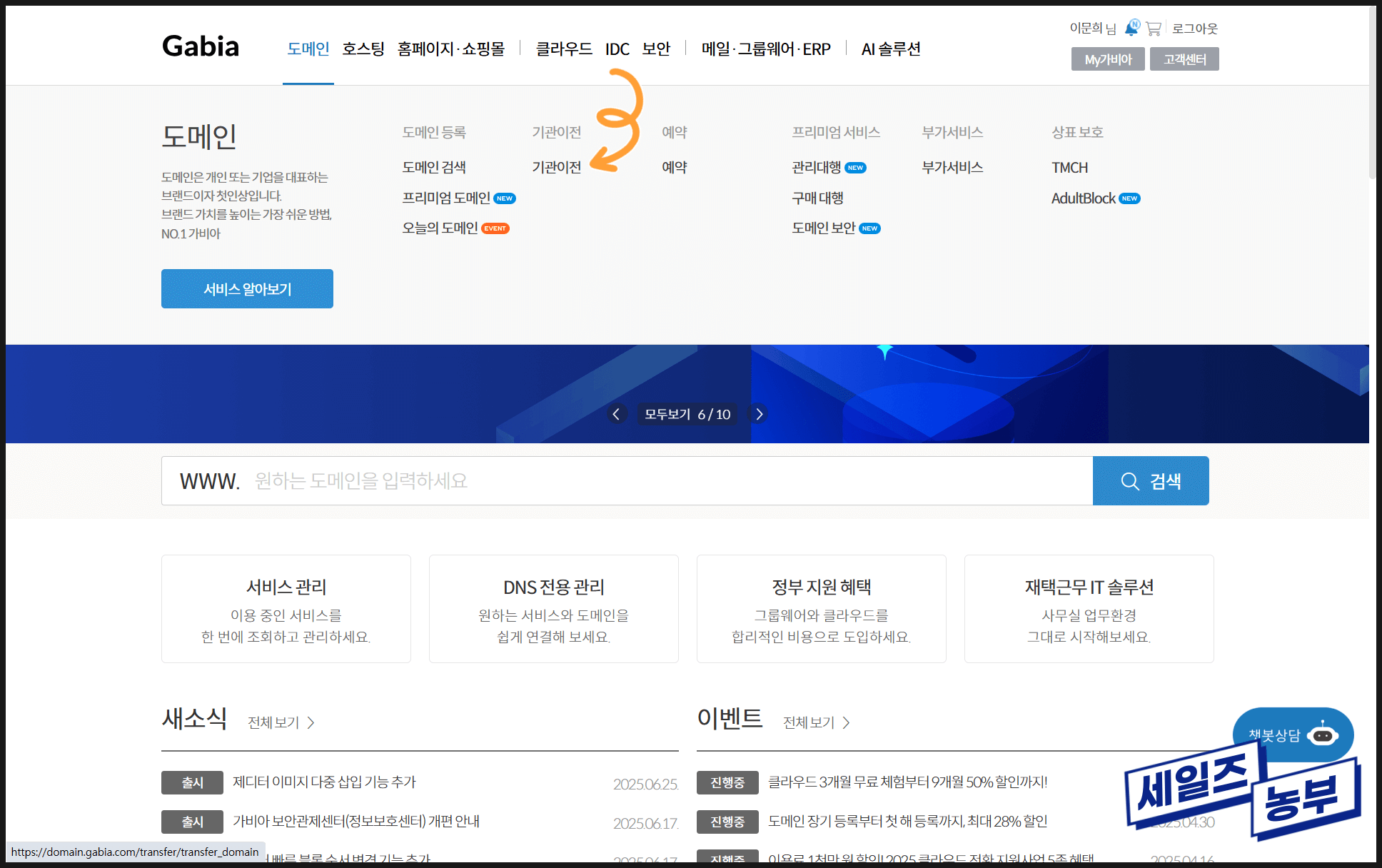 가비아 웹 사이트에 접속합니다. 회원 가입 후 로그인을 한 다음 '도메인' 메뉴를 클릭해주세요. 그럼 펼침 메뉴가 내려오는데 그곳에 보면 '기관이전'이라는 메뉴가 보일거예요. 이걸 클릭해줍니다.