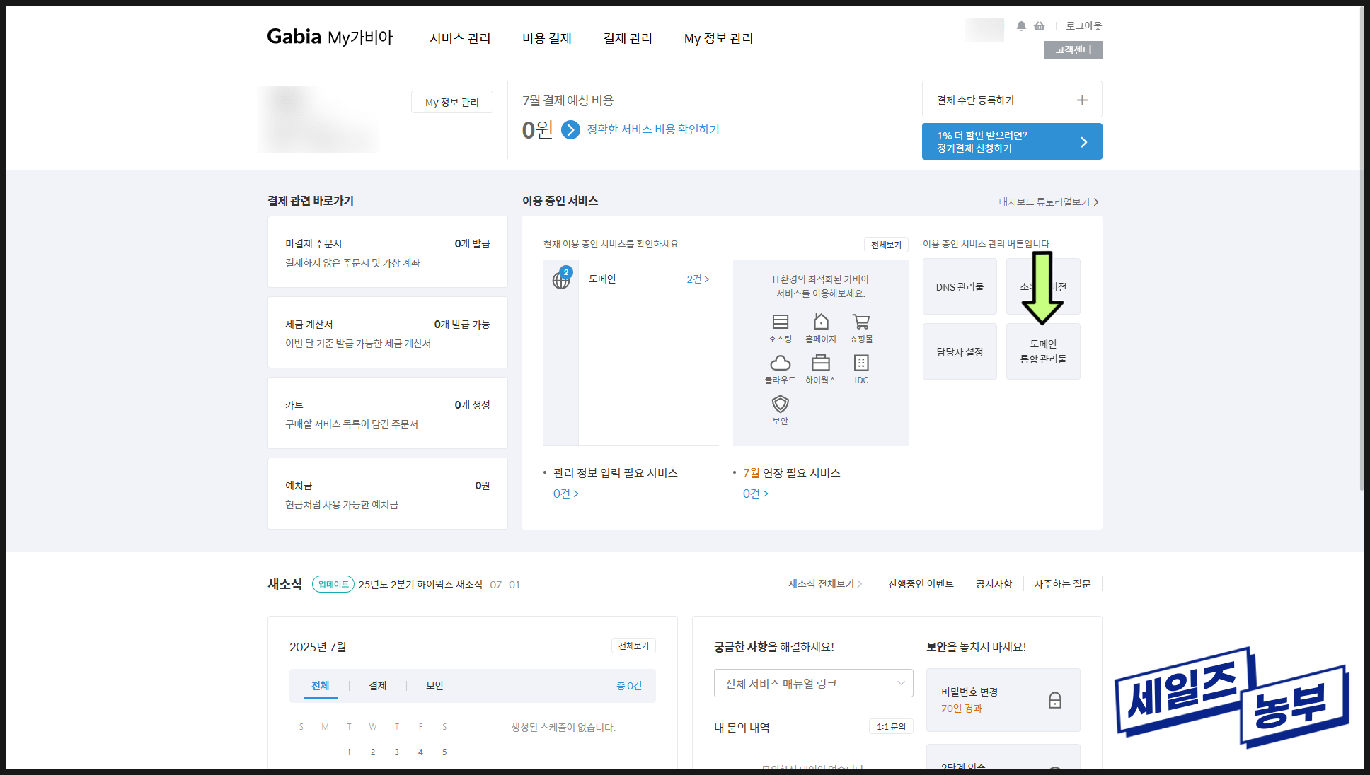 3. 서비스 목록에서 [도메인]을 클릭하거나, 보유 도메인 수 부분을 클릭합니다.