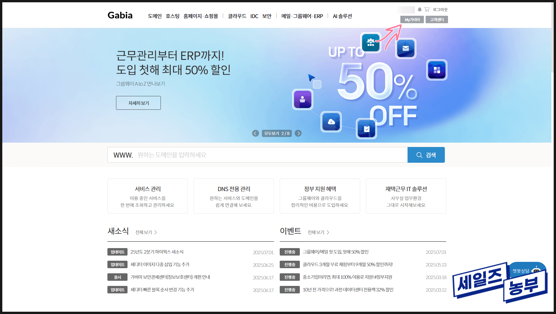 1. 가비아 홈페이지에 접속 후 로그인합니다.