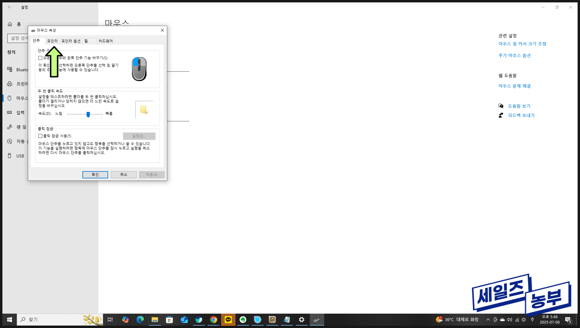 3. 포인터 탭 이동: '마우스 속성' 창이 나타나면 상단의 '포인터' 탭으로 이동합니다.